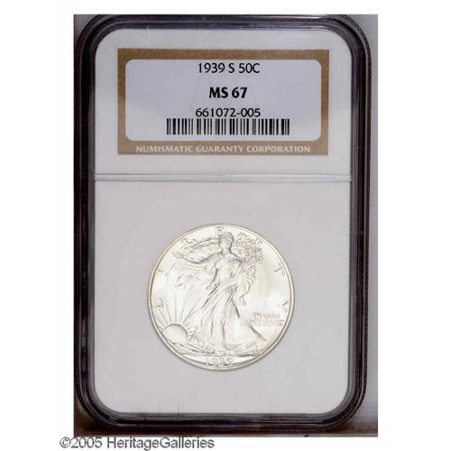 <B>1939-S<50C> MS67 NGC.</B></I> Brilliant save for a dash of orange color at 7:30 on the reverse. Lustrous and gorgeously void of contact. The strike is very good albeit not needle-sharp. Census: 59 in 67, 0 finer (10/05).