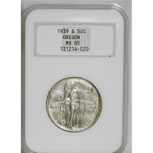 <B>1939-S<50C> Oregon MS65 NGC.</B></I> Patinated pale gray with wisps of champagne toning on the obverse and russet-gold on the reverse periphery. A nicely detailed Gem.