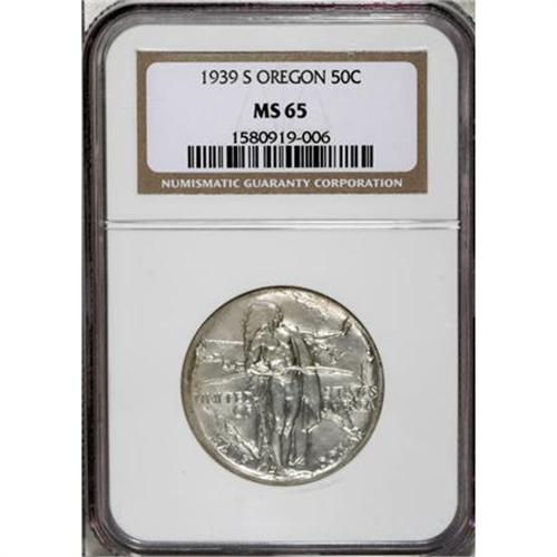 <B>1939-S 50C Oregon MS65 NGC.</B></I> NGC Census: (230/349). PCGS Population (354/300). Mintage: 3,005. Numismedia Wsl. Price for NGC/PCGS coin in MS65: $500. (#9354)<BR><BR><b>Shipping:</b> Coins & Currency (<a target="_blank" href="http://www.heritageauctions.com/common/shipping.php">view shipping information</a>\)