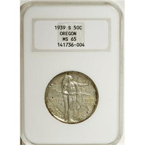 <B>1939-S 50C Oregon MS65 NGC.</B></I> NGC Census: (231/349). PCGS Population (357/302). Mintage: 3,005. Numismedia Wsl. Price for NGC/PCGS coin in MS65: $500. (#9354)<BR><BR><b>Shipping:</b> Coins & Currency (<a target="_blank" href="http://www.heritageauctions.com/common/shipping.php">view shipping information</a>)