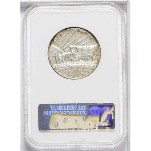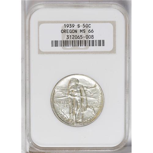 <B>1939-S<50C> Oregon MS66 NGC.</B></I> Light silver-gray patina has settled over much of this lustrous piece. Nicely struck with small spots of dark toning on the lower obverse and patchy dark green toning at the reverse periphery. Housed in an older generation holder.
