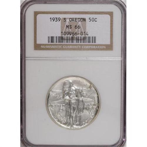 <B>1939-S 50C Oregon MS66 NGC.</B></I> Minimally toned and sharply struck, an interesting Premium Gem representative from this final-year Oregon issue of only 3,005 pieces. NGC has graded 83 finer pieces (1/08).<BR><BR><b>Shipping:</b> Coins & Currency (<a target="_blank" href="http://www.heritageauctions.com/common/shipping.php">view shipping information</a>)