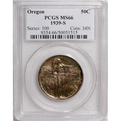 <B>1939-S 50C Oregon MS66 PCGS.</B></I> Lavish jade-green, autumn-gold, and champagne-pink toning graces this lustrous and precisely struck Premium Gem. A low mintage issue from the twilight year of the long-lived commemorative type.<BR><I>From The Cary & Cheryl Porter Collection, Part Three.</B></I><BR><BR><b>Shipping:</b> Coins & Currency (<a target="_blank" href="http://www.heritageauctions.com/common/shipping.php">view shipping information</a>\)
