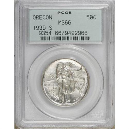 <B>1939-S 50C Oregon MS66 PCGS.</B></I> PCGS Population (230/78). NGC Census: (266/83). Mintage: 3,005. Numismedia Wsl. Price for NGC/PCGS coin in MS66: $750. (#9354)<BR><BR><b>Shipping:</b> Coins & Currency (<a target="_blank" href="http://www.heritageauctions.com/common/shipping.php">view shipping information</a>)