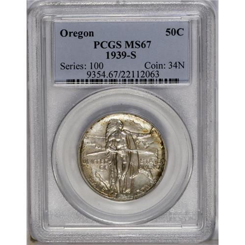 1939-S 50C Oregon MS67 PCGS. Speckled gold-green, russ