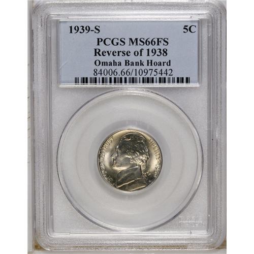 <B>1939-S 5C Reverse of 1938 MS66 Full Steps PCGS.</B></I> Ex: Omaha Bank Hoard. The "Wavy Steps" subtype, which constitutes about two-thirds of the 1939-S production, per Breen. This splendidly preserved Premium Gem has light tan toning and a sharp strike. The 1939-S is a traditional key to the series. Population: 14 in 66, 0 finer (11/06).<BR><BR><b>Shipping:</b> Coin/Currency (<a target="_blank" href="http://www.heritageauctions.com/common/shipping.php">view shipping information</a>)