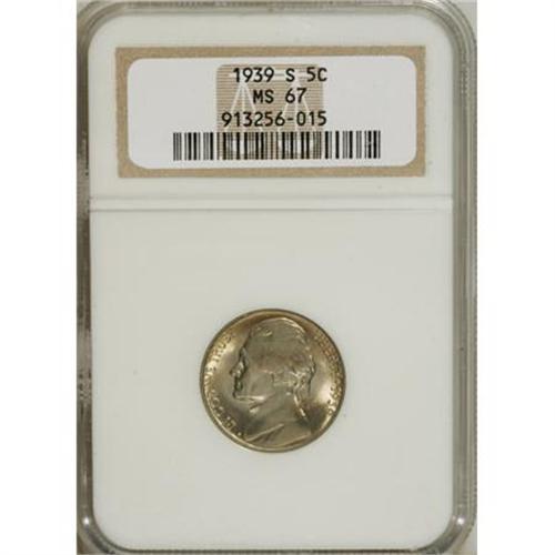 <B>1939-S 5C Reverse of 1938 MS67 NGC.</B></I> NGC Census: (105/0). PCGS Population (7/0). Mintage: 6,630,000. Numismedia Wsl. Price for NGC/PCGS coin in MS67: $300. (#4006)<BR><BR><B>Coin Engraver:</B> Felix Schlag<BR><BR><b>Shipping:</b> Coins & Currency (<a target="_blank" href="http://www.heritageauctions.com/common/shipping.php">view shipping information</a>)