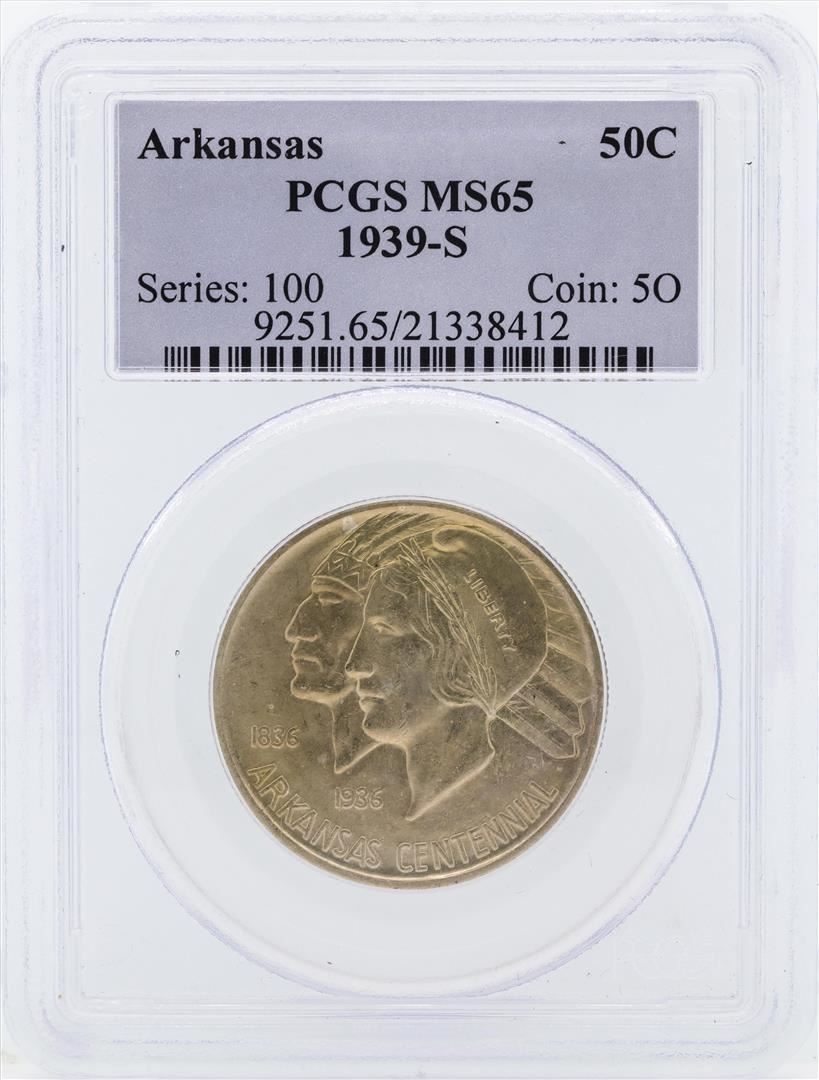 One 1939-S Arkansas Centennial Commemorative Half Dollar Coin PCGS MS65. PCGS Graded.