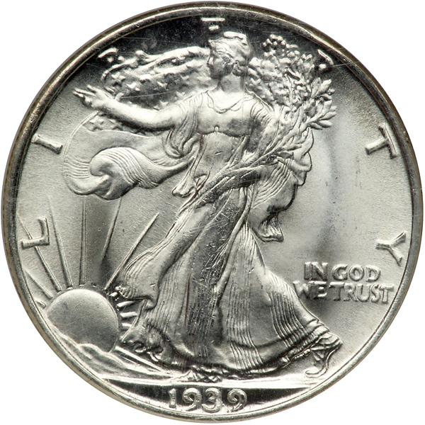 1939-S Liberty Walking Half Dollar. NGC graded MS-67. A nice white coin, the glistening ice-smooth fields stream light out in every direction of this superb piece.