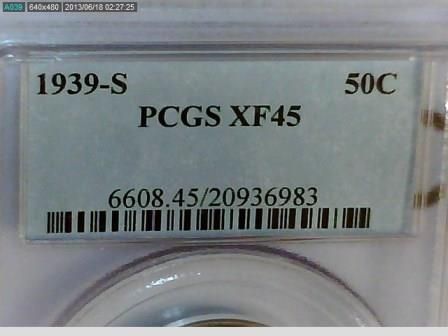 1939 S WALKING LIBERTY HALF DOLLAR. PCGS CERTIFIED XF45. PCGS CERT #20936983. COIN HAS SOME DARK TONING. NOT AS DARK AS THE OTHER COINS LISTED, BUT IT IS VERY DARK.