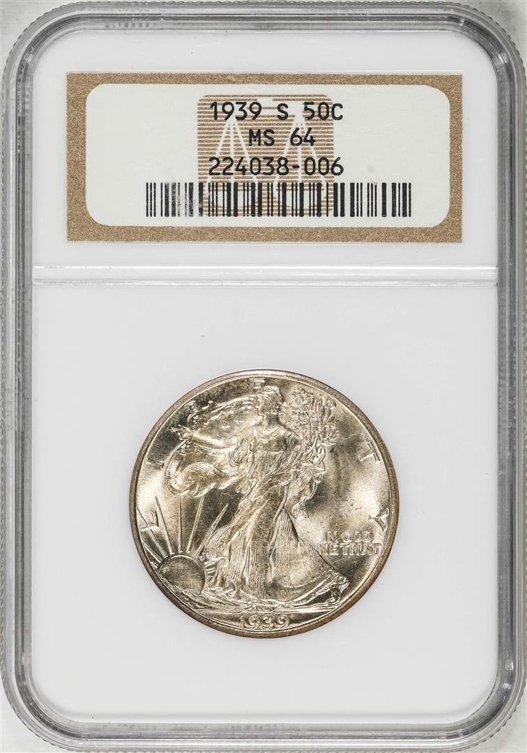 One 1939-S Walking Liberty Half Dollar Coin NGC MS64. NGC Certified.