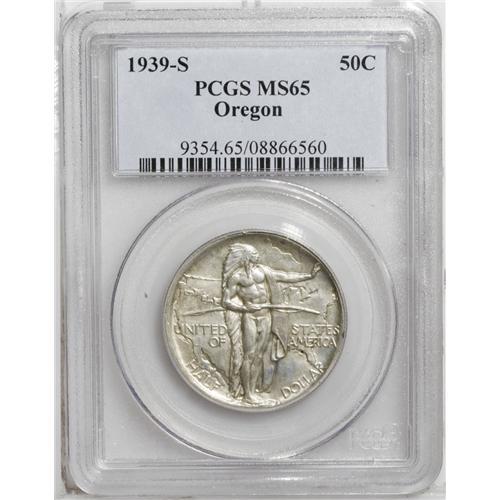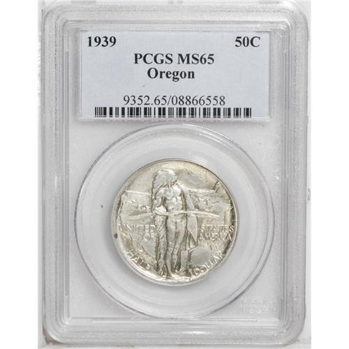 <B>1939<img border='0' src='http://www.heritagecoins.com/images/star.gif' width=10 height=10>ET> Oregon PDS Set MS65 PCGS.</B></I> The set consists of a: <B>1939 MS65,</B></I> lustrous gray-gold surfaces, well struck; <B>1939-D MS65,</B></I> well struck gray-gold surfaces with hints of deeper color on the reverse; and a <B>1939-S MS65,</B></I> attractive light amber-gold patina on each side. A well matched set from the final year of issue for this longest-running commemorative series.