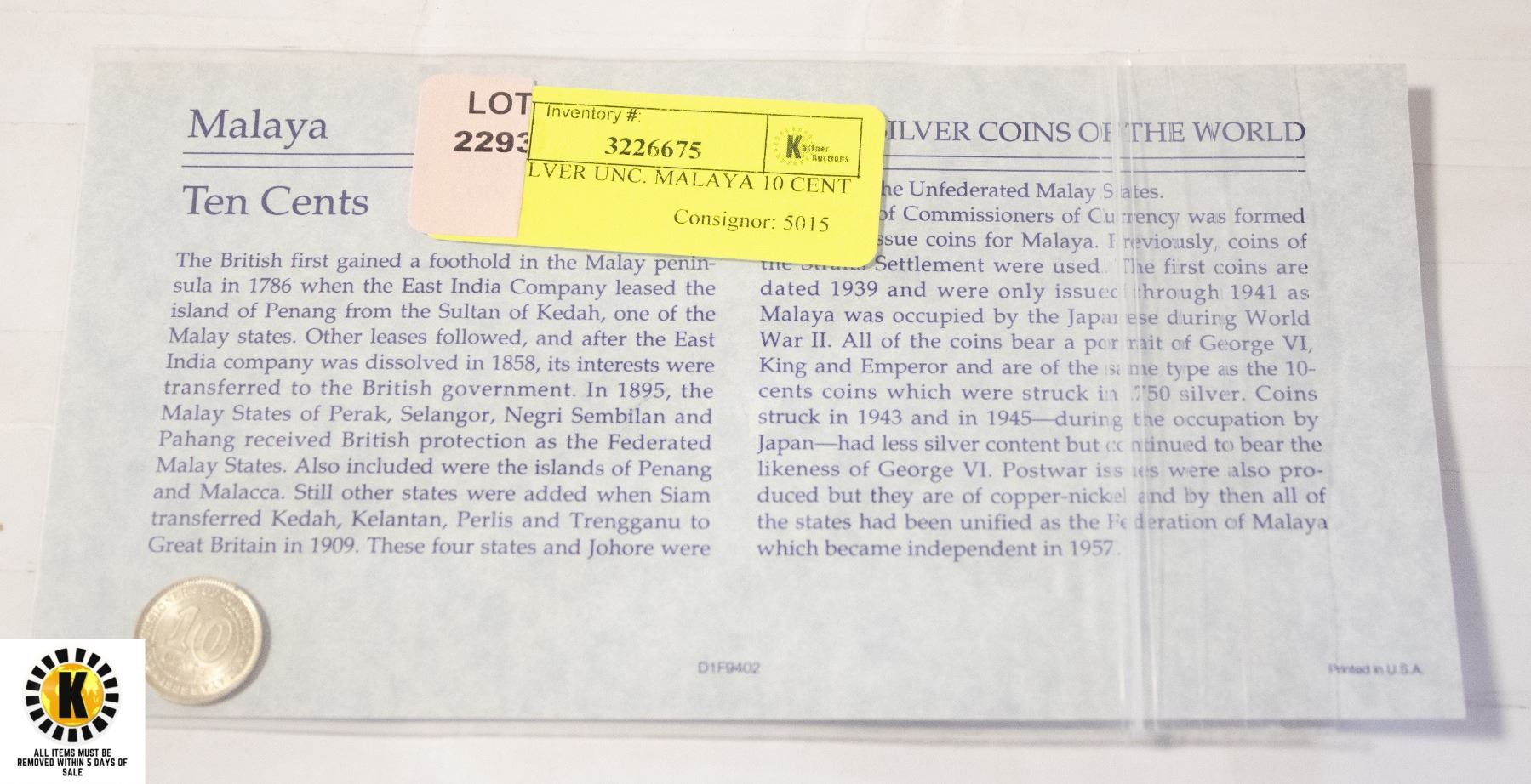 1939 SILVER UNC. MALAYA 10 CENT COIN