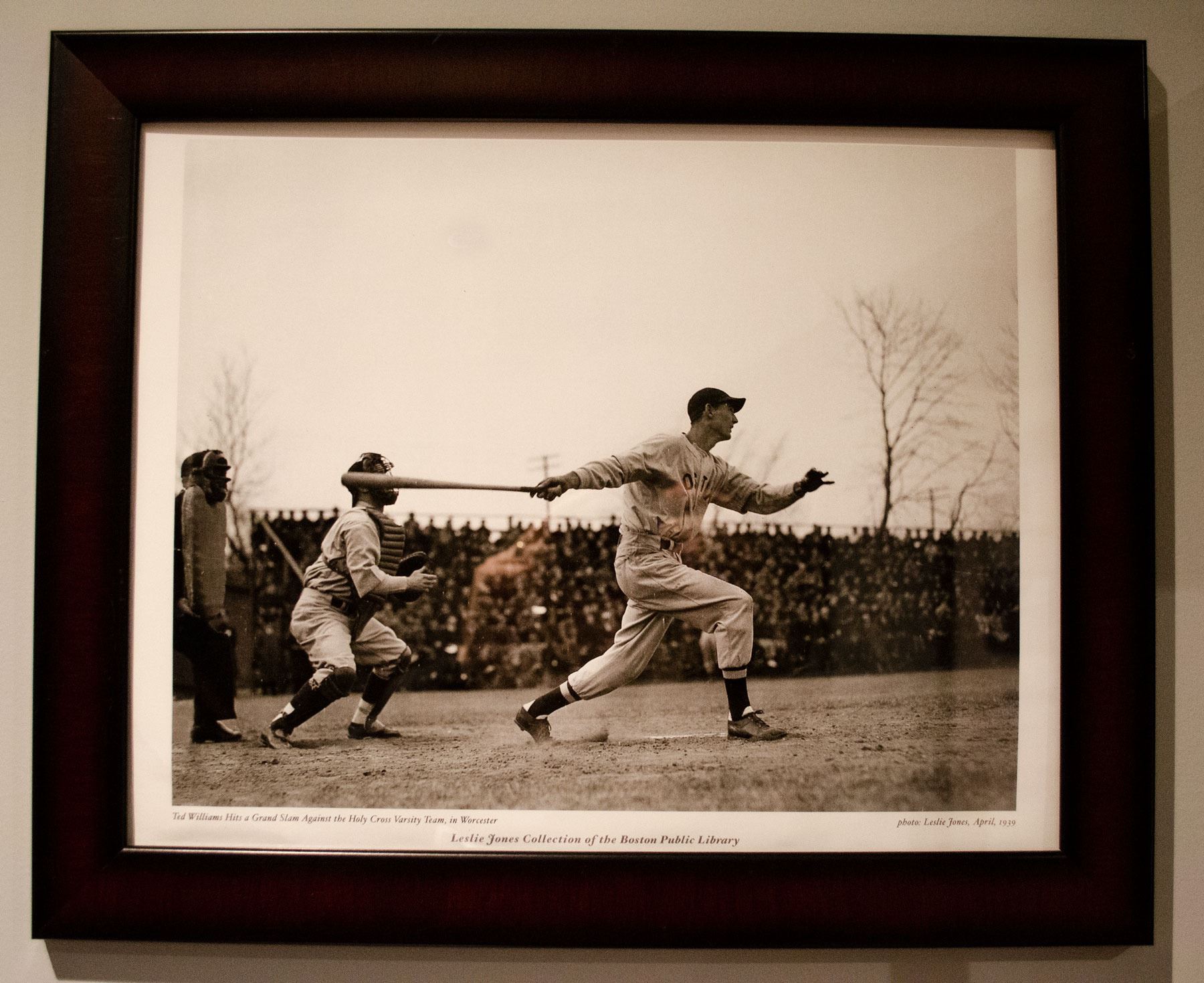 Ted Williams hits a Grand Slam against Holy Cross Varsity Team in Worcester. Leslie Jones Collection of the Boston Public Library. April, 1939
