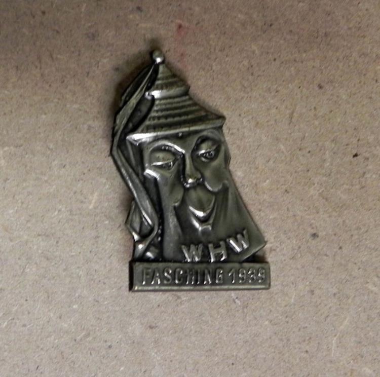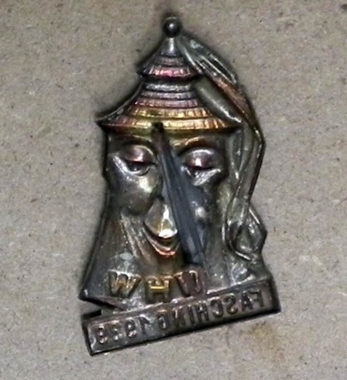 OFFERED HERE IS A 1939 WHW FASCHING NAZI PIN W/SMILING MASK & PINBACK - FASCHING IS GERMAN MARDI GRAS.