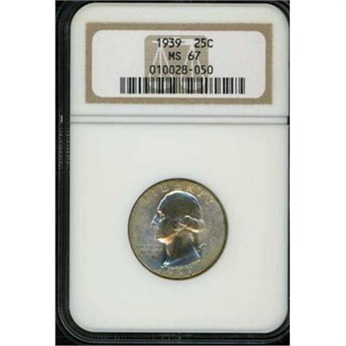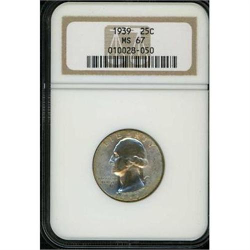 <b>1939 Washington Quarter Dollar. NGC graded MS67.</b> Extra frosty cartwheel luster. Superb! <b>(PCGS # 5808)</b>