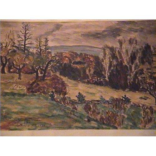 This is a nice big original water color in super style and colors. It shows a beautiful view of Castine Maine and her wonderful coast. The painting is done with water color and pen and ink on paper. It is signed Barrie Barstow Greenbie Castine ME. October 27, 1939 lower left and then to the right of that it reads For Shirley From a fellow Maineiac Barrie. Barrie Greenbie is a well listed 20th century American artist associated with Castine Maine and a WPA artist and muralist. The details in the painting are wonderful I can particularly appreciate the old logging truck on the side of the farm road leading to the gorgeous coast line. The painting measures 12 x 18 actual view size not including mat or frame. The mat and frame are rather amaturely done probably by Shirley. We have left it as we found it. The painting is in excellent condition. <p>Shipping and insurance are determined after checkout. <p>