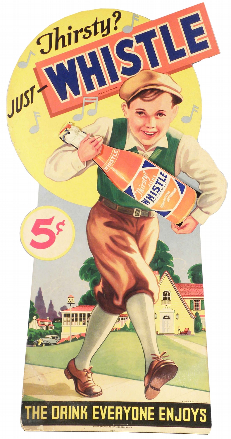 1939 Whistle Soda Die Cut Cardboard Sign.The bottle comes out and can be used as a fan pull. You can alos put a real bottle in the boys hands. Some slight water damage bottom left corner otherwise Excellent condition. 13 X 26 inches.