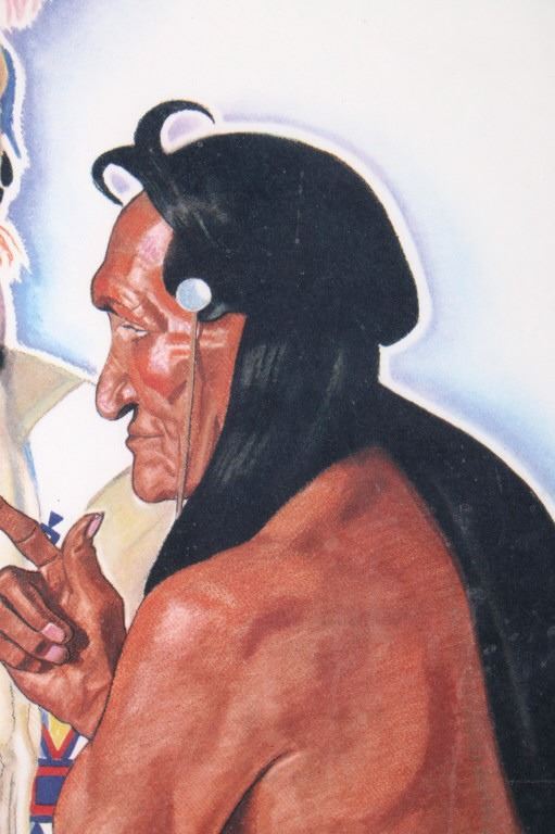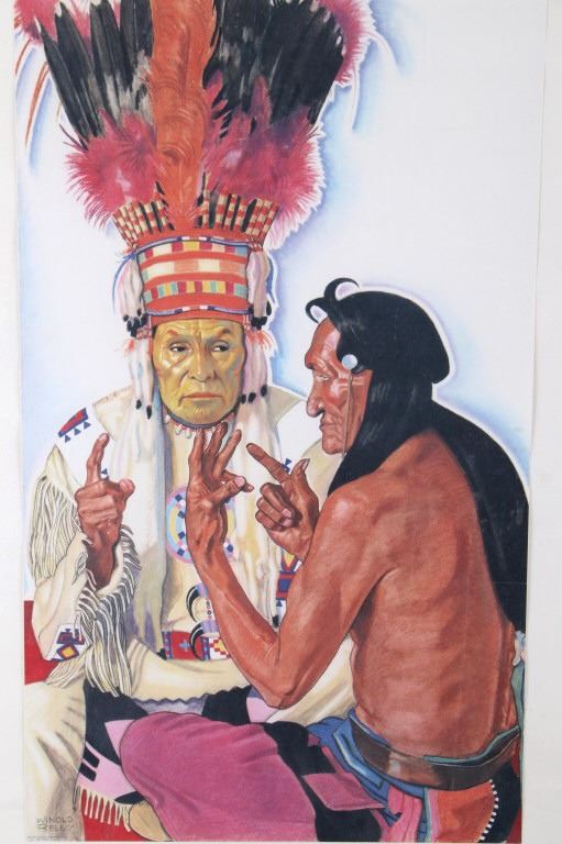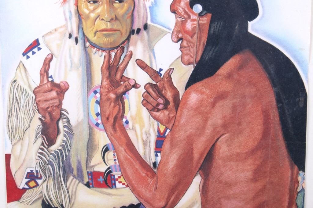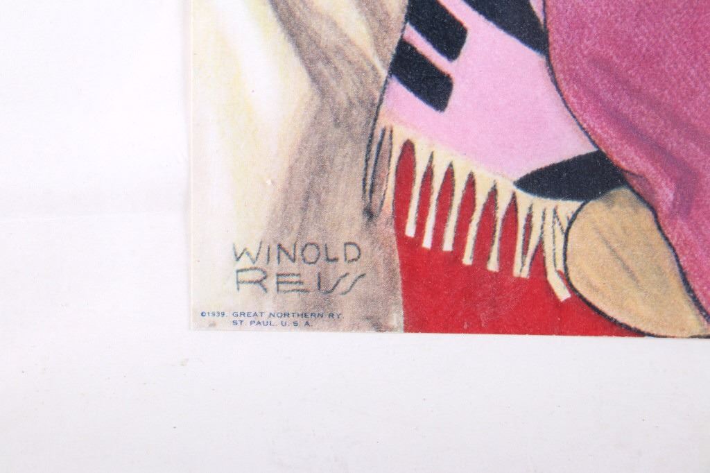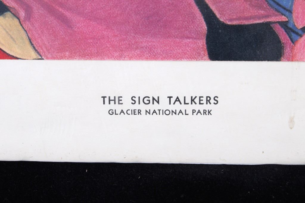 Featured in this lot is this Winold Reiss lithograph poster called "The Sign Talkers", circa 1939. The poster features a two-part construction with a cream backing and a decorative lithograph of two Native American men sign talking. The lithograph is from Winold Reiss and is signed in the bottom left-hand corner. Winold Reiss was born in Germany in 1886. Following in the footsteps of his father, Winold became an artist, studying art in Munich. In 1913, Winold came to the United States with a romantic idealism of Native Americans and the vast Western Frontier. 1919 found Winold Reiss in Montana, where he befriended Natives in the Blackfoot tribe. He made pastel portrait drawings of many of the Blackfeet he had met. Reiss was able to capture individual traits, as well as a high degree of human dignity; his portraits were sensitive and sympathetic depictions. This sign is associated with Glacier National Park. The condition of this lithograph is fair, with browning to the exposed and wrinkling to the corners of poster. The measurements of this poster are 24" x 15 1/2".
