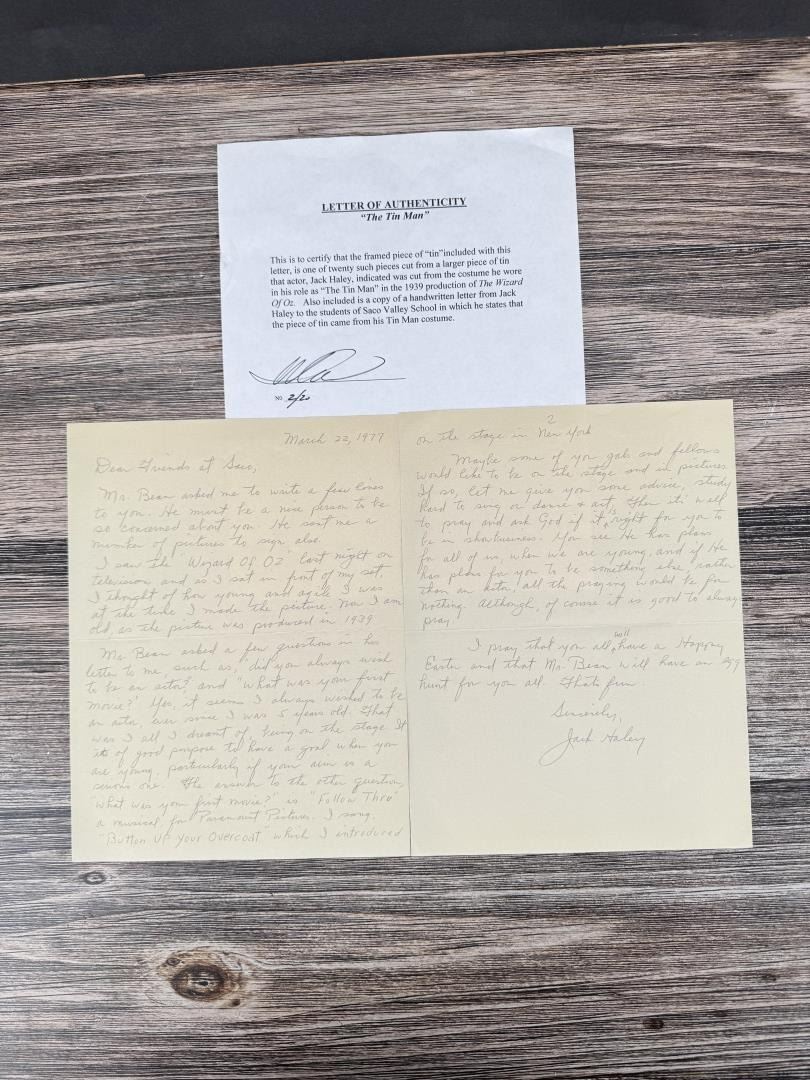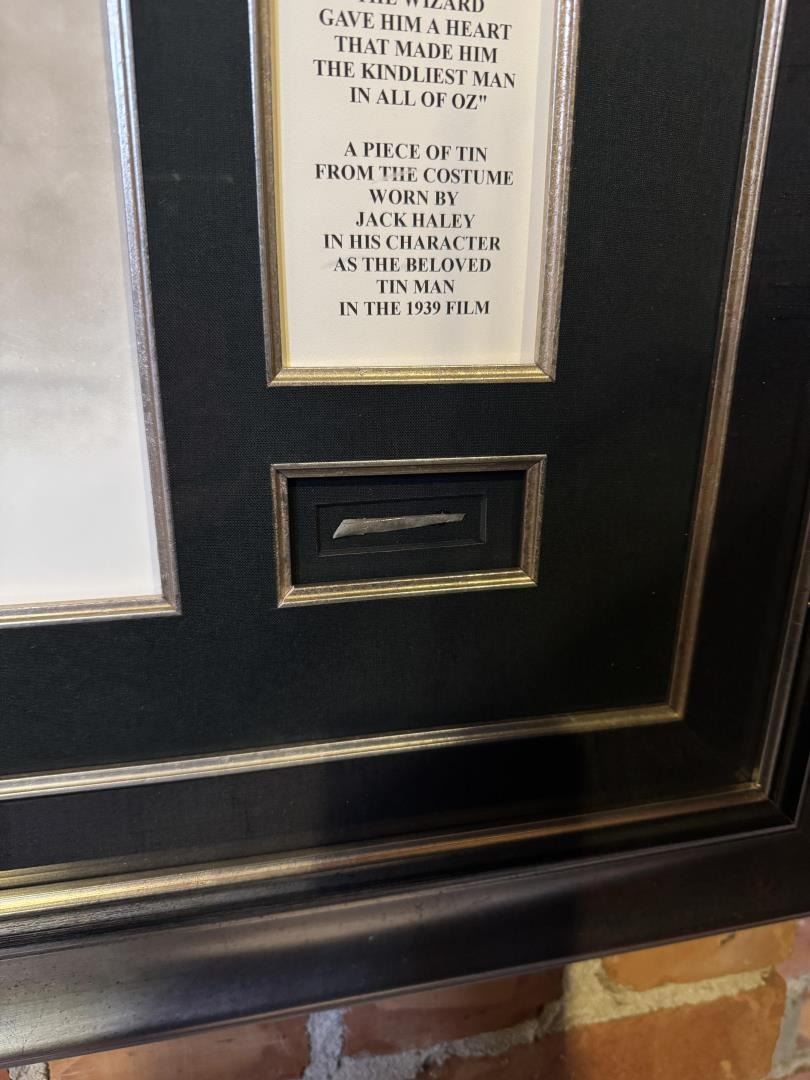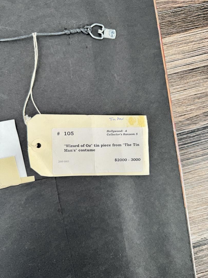Original Piece of Tin taken from the costume worn by Jack Haley in his role as the Tin Man in the 1939 production of The Wizard of OZ. 22" by 24". Comes with Autographed Letter From Jack Haley.