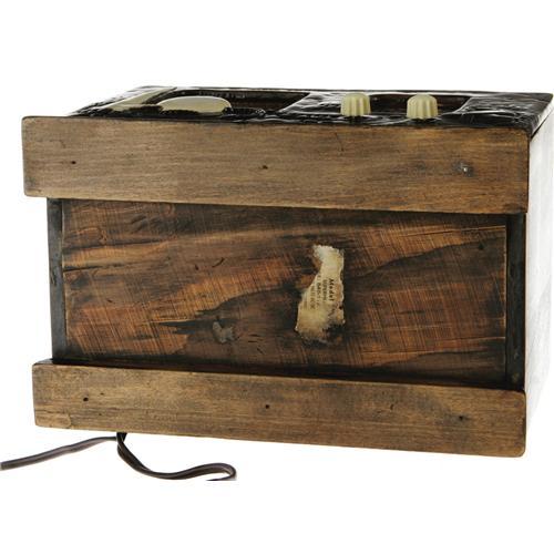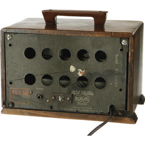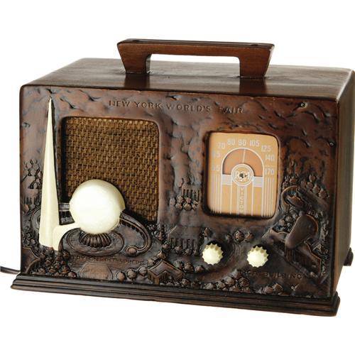 <B>1939 World's Fair RCA Radio.</B></I> This fantastic souvenir was released as a promotion for RCA's television debut at the 1939-40 New York World's Fair. The radio cabinet's front, made of molded imitation wood, prominently displays the fair's Trylon and Perisphere trademarks. To the far right, near the tuning dial, is a supplementary rendering of RCA's exhibition building. A very attractive antique radio associated with a specific historic event. A small area of loss on the dial's RCA logo, else beautiful condition. Complete with original cord and electrical plug. 9.25" wide x 7.25" high x 6" deep. One of the best 1939 Fair collectibles. <BR><BR><B>Important notice