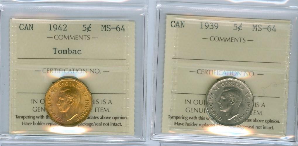 1939 and 1942 5¢. Tombac Lot of 2 ICCS graded coins, both ICCS MS64. Includes