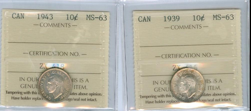 1939 and 1943 Lot of 2 ICCS graded 10¢ coins, both MS63 and