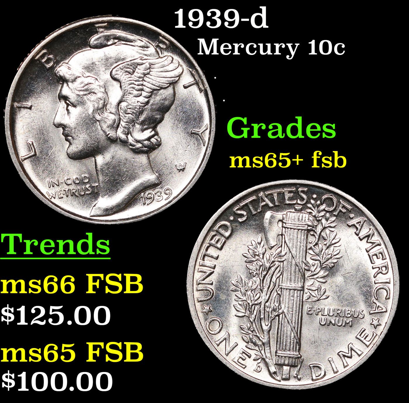 1939-d Mercury Dime 10c Grades GEM+ FSB.