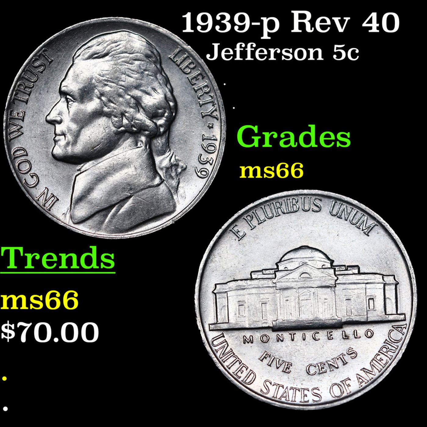1939-p Rev 40 Jefferson Nickel 5c Grades GEM+ Unc.