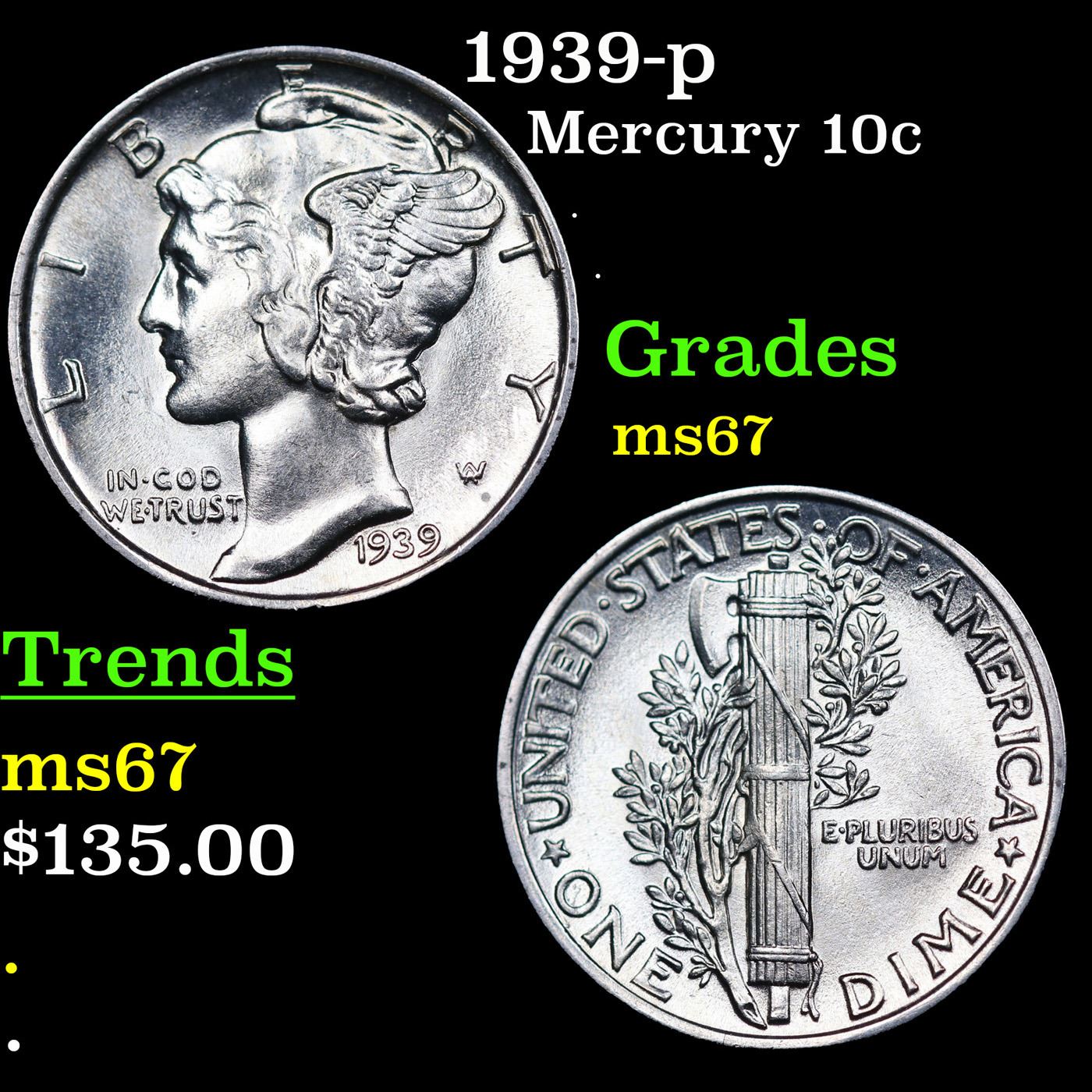 1939-p Mercury Dime 10c Grades GEM++ Unc.