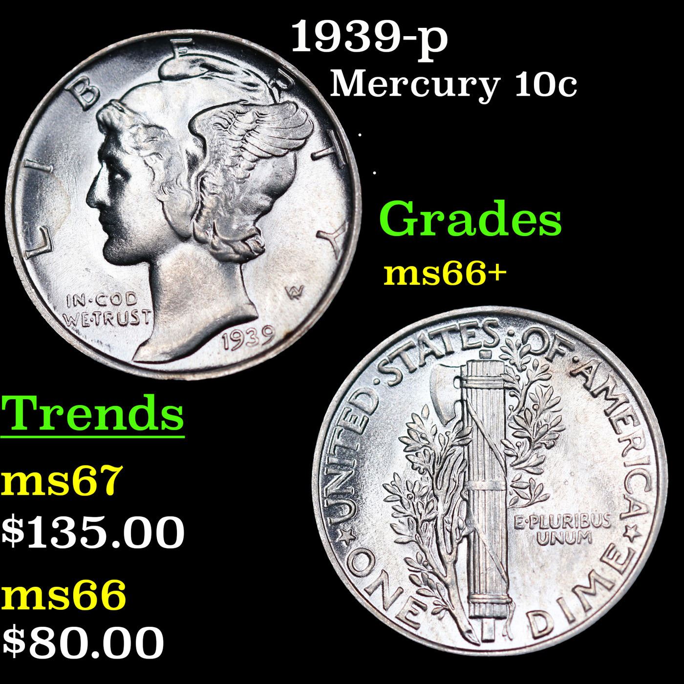 1939-p Mercury Dime 10c Grades GEM++ Unc.