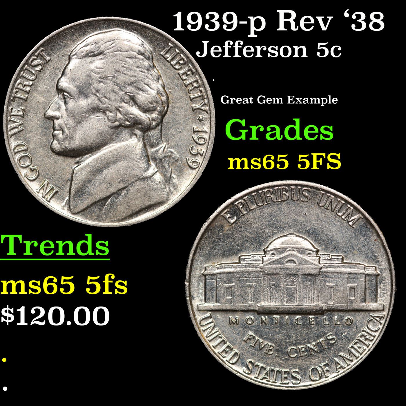 1939-p Rev '38 Jefferson Nickel 5c Grades GEM 5fs.