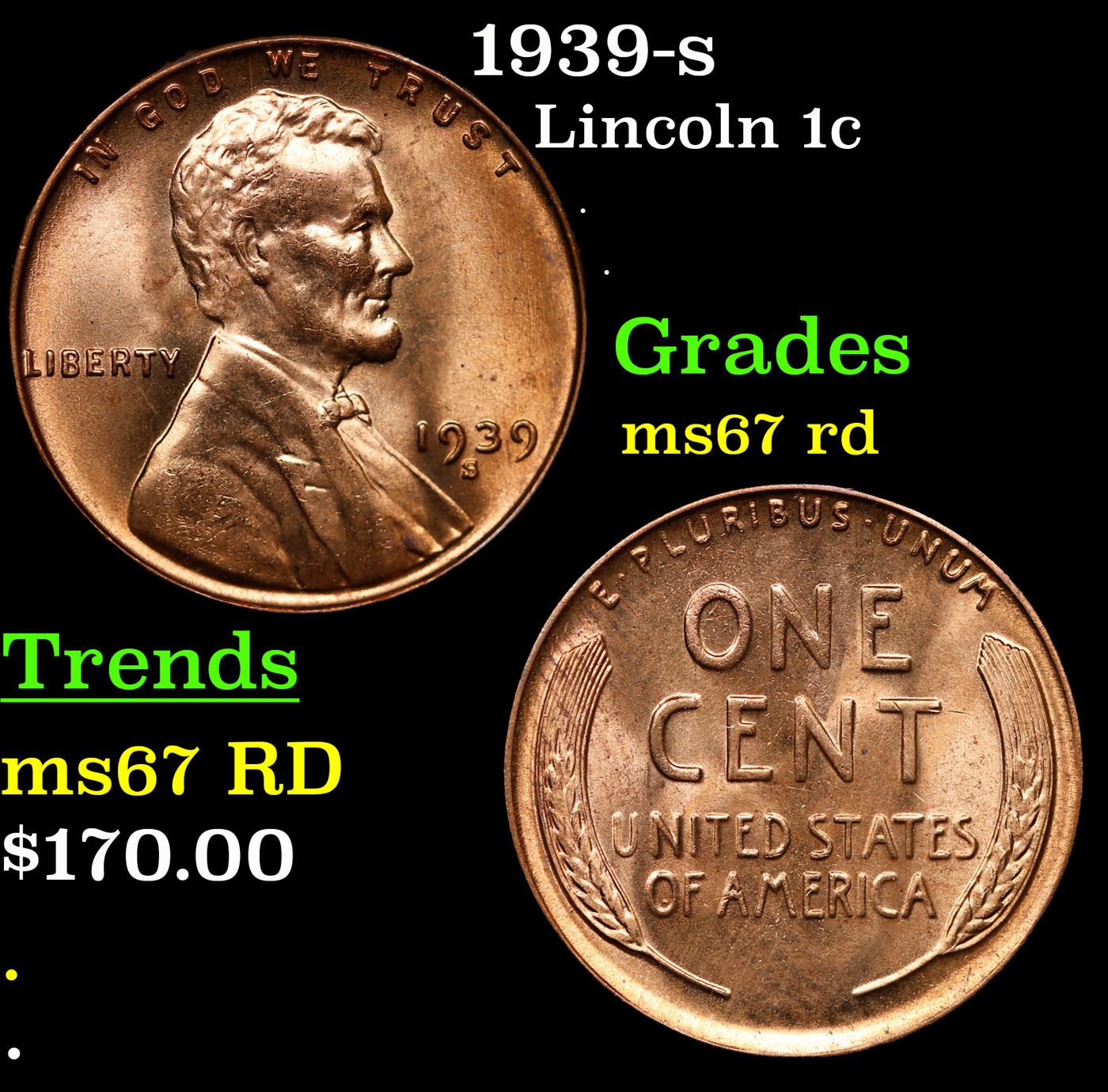 1939-s Lincoln Cent 1c Grades GEM++ Unc RD.