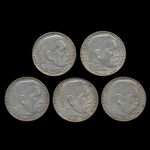 1939A/B/F/G/J Nazi Germany 2 Mark Silver Hi Grade 5 Pcs (COI-8087)
