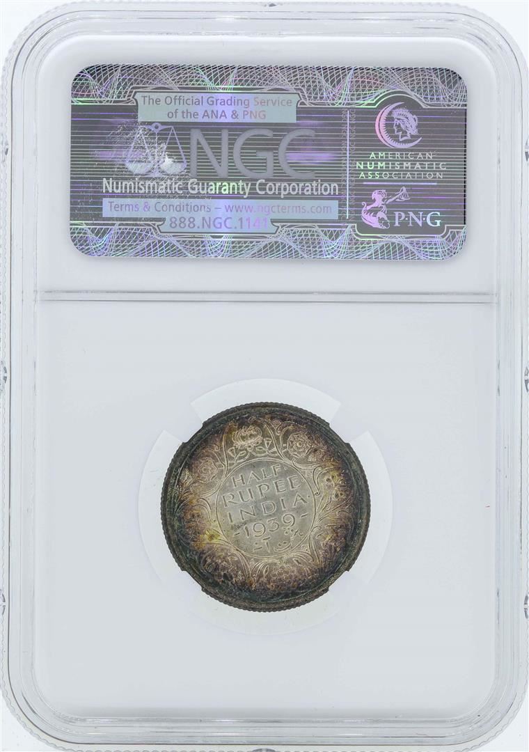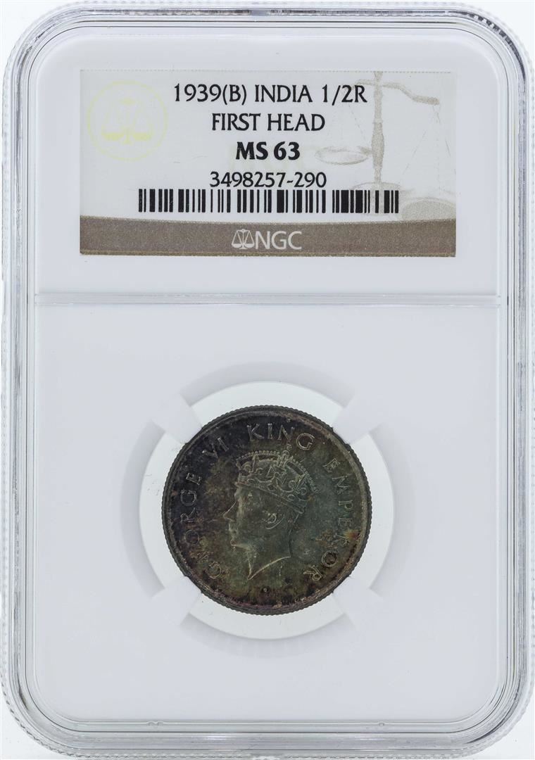One 1939B India 1/2 Rupee First Head Coin NGC MS63. NGC Certified.