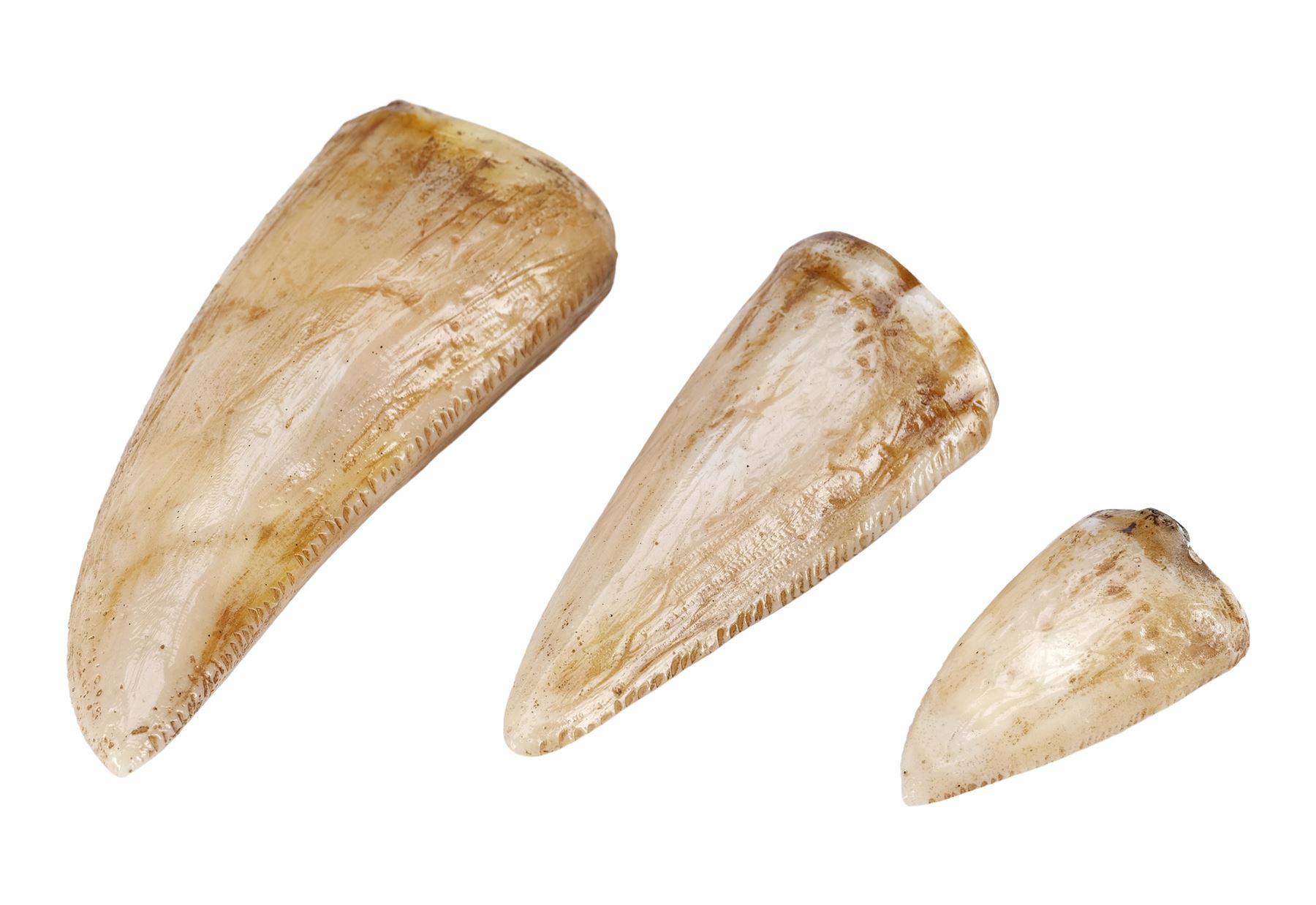 JURASSIC PARK (1993) - Set of Three Tyrannosaurus Rex Teeth - Three Tyrannosaurus Rex teeth from Steven Spielberg's Jurassic Park. Freed from her containment pen after a power outage, the T-Rex attacked Tim (Joseph Mazzello) and Lex (Ariana Richards) while they toured their grandfather's dinosaur-filled theme park.
