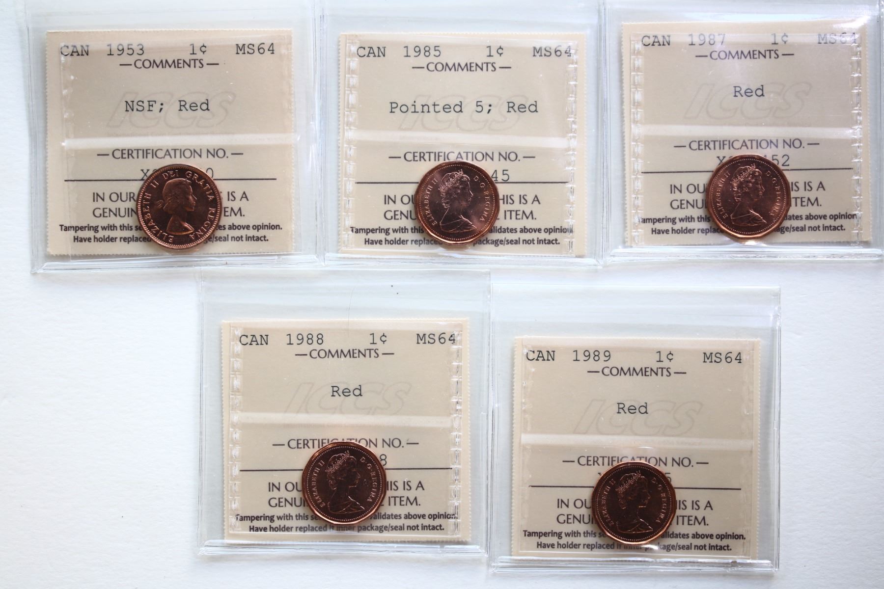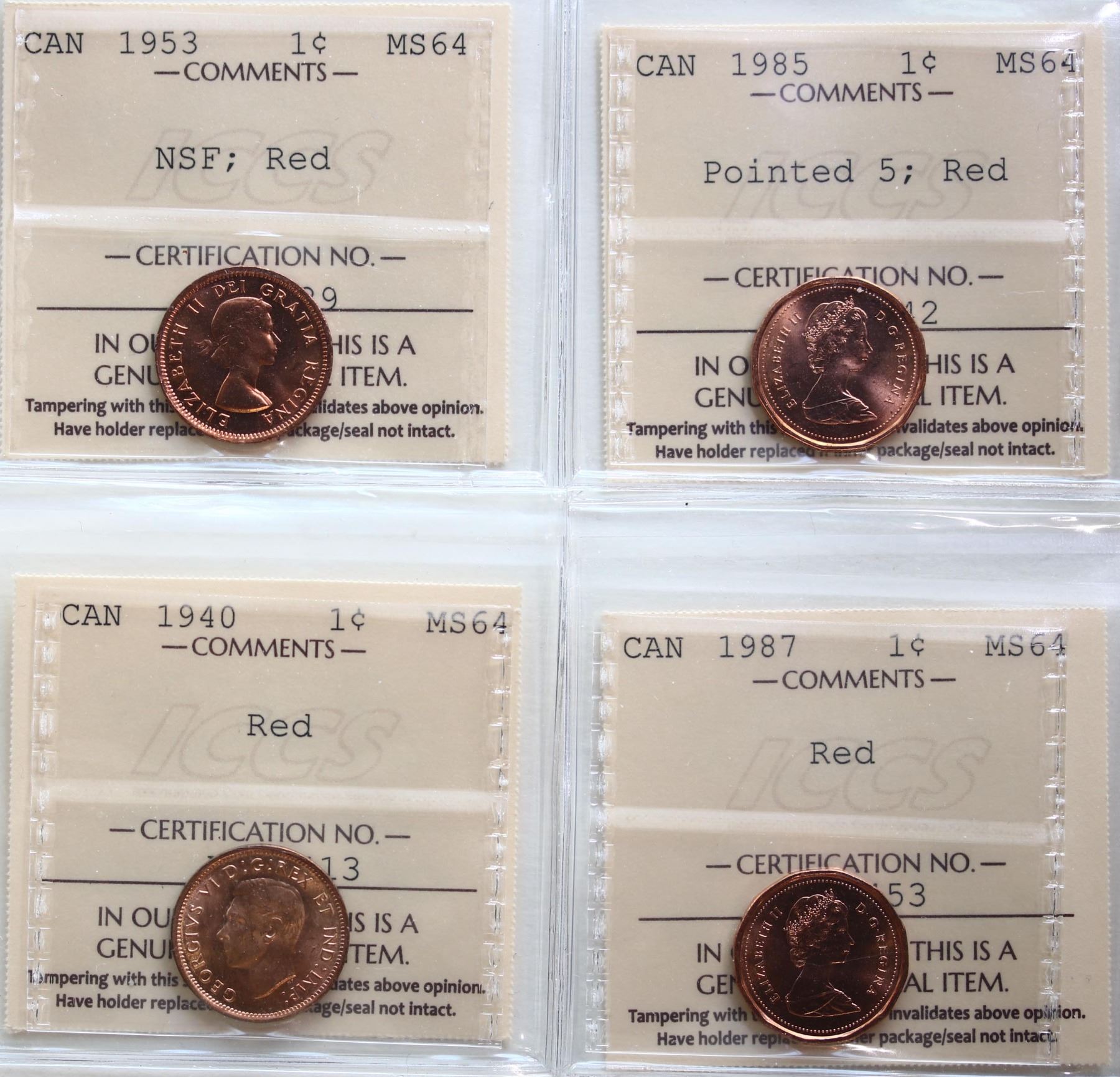 1940 1¢, 1953 "NSF", 1985 "Pointed 5", 1987, Lot of 4 coins ICCS Choice Mint State-64 Red.