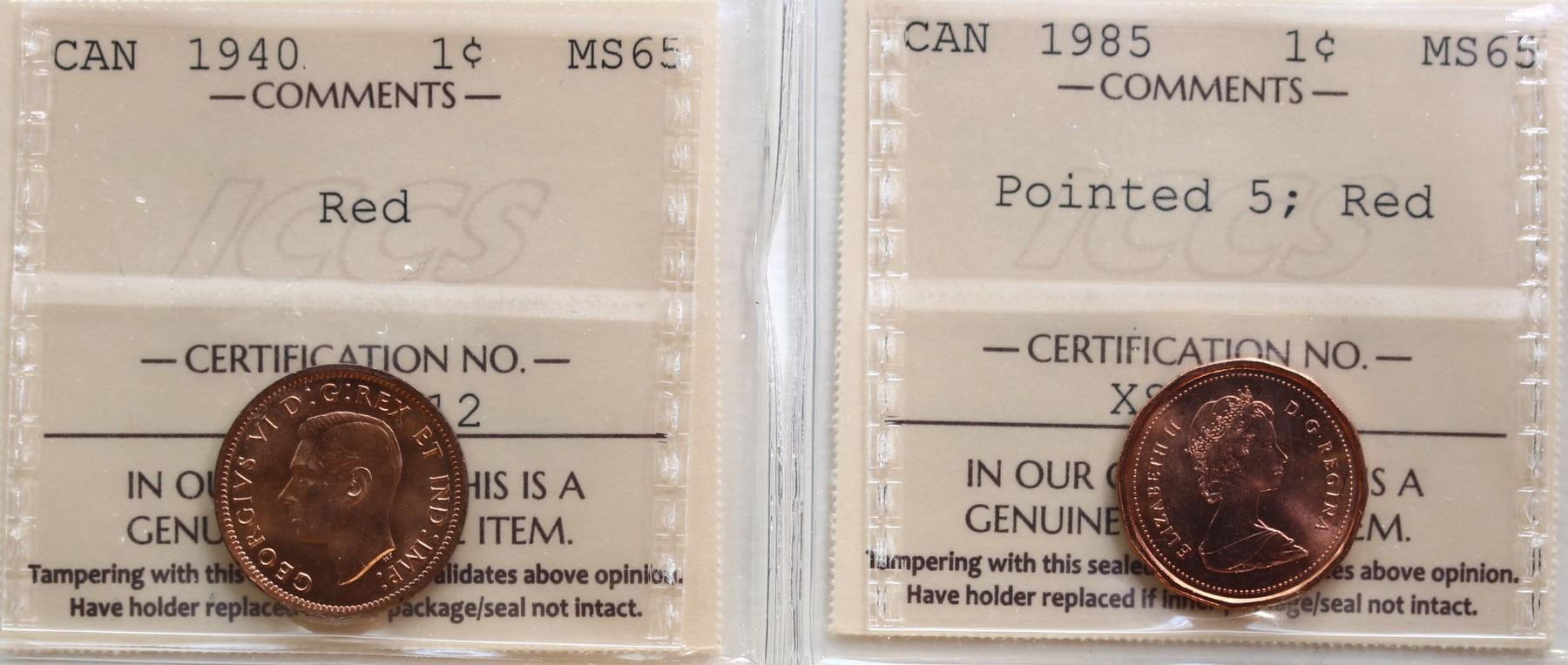 1940 1¢, 1985 "Pointed 5", 1989, Lot of 3 coins ICCS Gem Mint State-65 Full red.