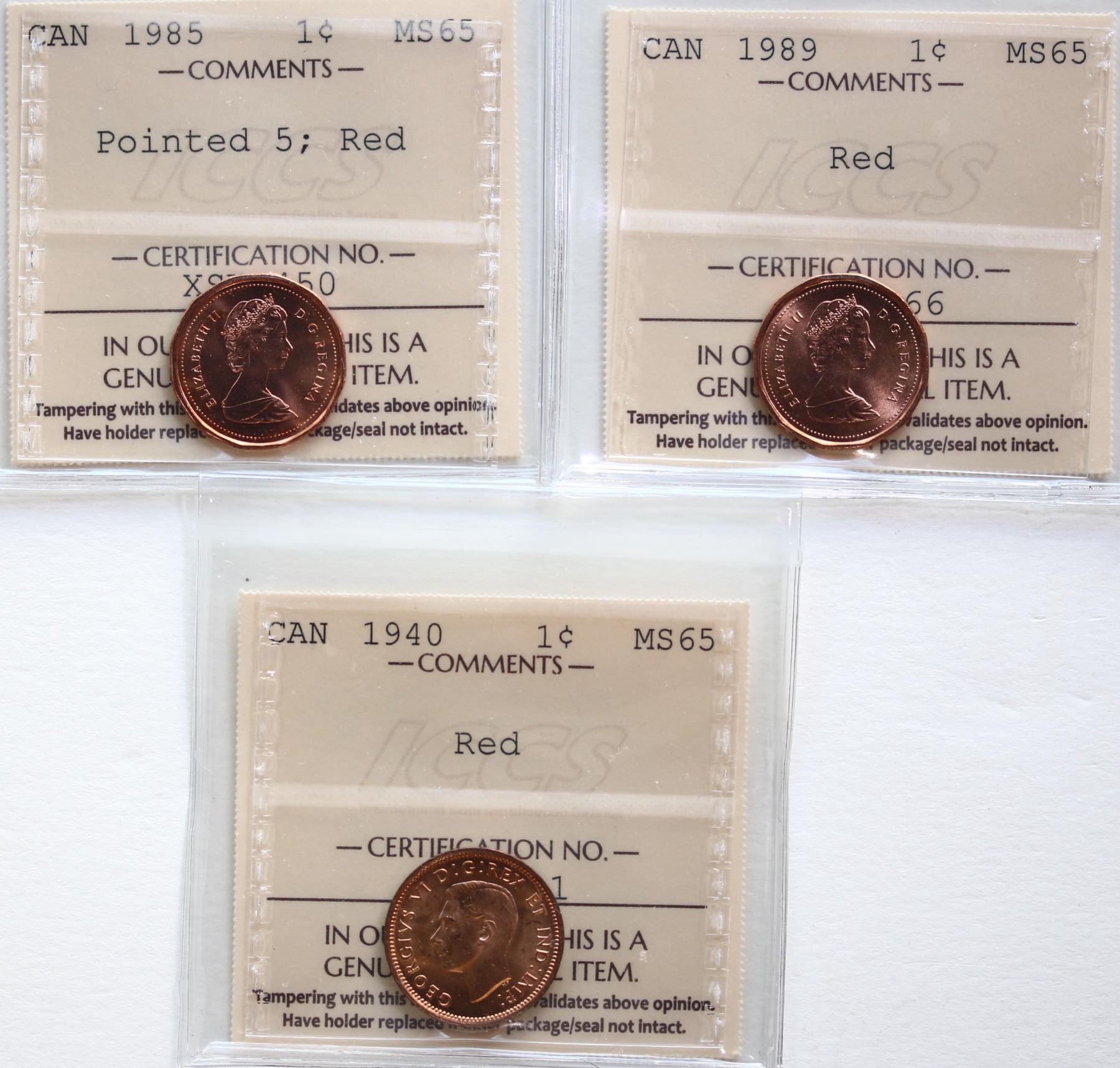 1940 1¢, 1985 "Pointed 5" Both coins ICCS Gem Mint State-65 Full red.