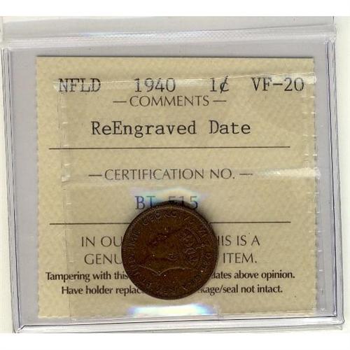 1940 1¢ Nfld Re-engraved ICCS VF20.