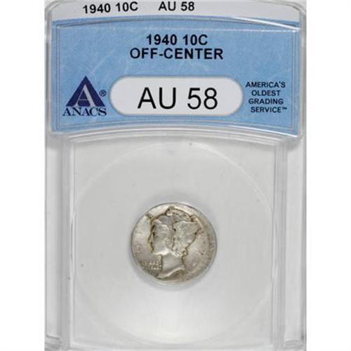 <B>1940 10C Dime--Off Center--AU58 ANACS.</B></I><BR><BR><B>Coin Engraver:</B> Adolph A. Weinman<BR><BR><b>Shipping:</b> Coins & Currency (<a target="_blank" href="http://www.heritageauctions.com/common/shipping.php">view shipping information</a>)