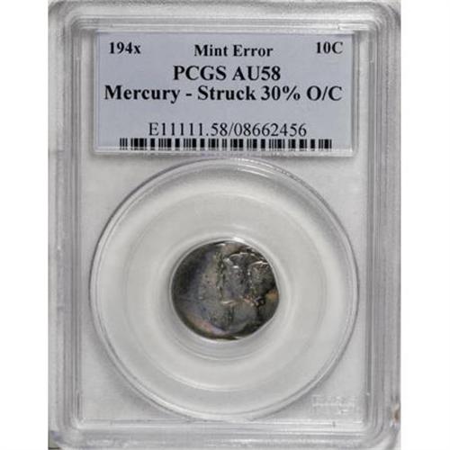<B>No Date 10C 194X Mercury Dime--Struck 30% Off Center--AU58 PCGS.</B></I><BR><BR><B>Coin Engraver:</B> Adolph A. Weinman<BR><BR><b>Shipping:</b> Coins & Currency (<a target="_blank" href="http://www.heritageauctions.com/common/shipping.php">view shipping information</a>\)