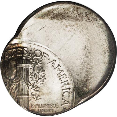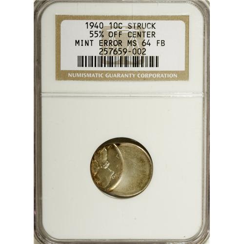 <B>1940-? 10C Mercury Dime MS64 Full Bands NGC.</B></I> Widely struck off center toward 10:30, taking the mintmark, if any, off the flan. The date is bold, however. The denomination and most of IN GOD WE TRUST are absent. E PLURIBUS UNUM is fully intact. A well preserved and lustrous piece with attractive light tan-gold patina.<BR><BR><b>Shipping:</b> Coin/Currency (<a target="_blank" href="http://www.heritageauctions.com/common/shipping.php">view shipping information</a>)