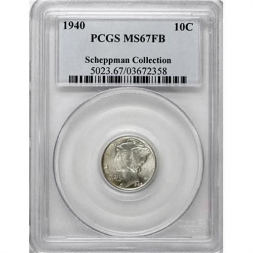 <B>1940 10C MS67 Full Bands PCGS.</B></I> Boldly impressed with hints of olive toning at the reverse margins and subtle elements of gold over each side. Marvelous luster and a similarly impressive strike contribute to this coin's immense eye appeal. PCGS has graded 15 finer Full Bands examples (12/07).<BR><I>From The Scheppman Collection, #4 PCGS Registry of Full Band Mercury Dimes.</B></I><BR><BR><B>Coin Engraver:</B> Adolph A. Weinman<BR><BR><b>Shipping:</b> Coins & Currency (<a target="_blank" href="http://www.heritageauctions.com/common/shipping.php">view shipping information</a>)