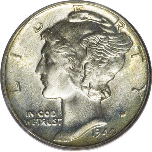 <B>1940 10C MS68 Full Bands PCGS.</B></I> This is one of the finest examples of this date certified so far, with just 16 PCGS/NGC comparable submissions, some of which may represent multiple submissions of the same coin. The strike is superb, with only a peripheral letter or two showing softness at the top. Some delicate orange and yellow-green pastels gravitate to the borders, and the luster is outstanding. Neither side reveals any blemishes.<BR><BR><b>Shipping:</b> Coins & Currency (<a target="_blank" href="http://www.heritageauctions.com/common/shipping.php">view shipping information</a>)
