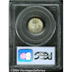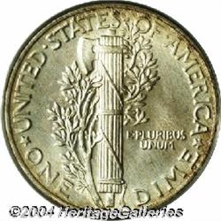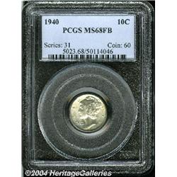 <B>1940<10C> MS68 Full Bands PCGS.</B></I> This is one of the finest examples of this date certified so far, with just 10 comparable submissions, some of those that may represent multiple submissions of the same coin. There are several different PCGS MS68 FB Mercury dimes in the present sale, affording the affable auction bidder an excellent chance to make an acquisition. Population: 11 in 68, 0 finer (9/04). <BR><BR><B>Important notice:</B> Heritage usually auctions material at the rate of 200-250 lots per hour. On some occasions eBay Live bid software or the Internet may not be able to keep up with the pace of the auction. We recommend placing a realistic absentee bid now as insurance to avoid disappointment. Occasionally the auctioneer may eliminate or reject an eBay Live bid, and the auctioneer may also reopen a lot after the close of the eBay live bidding (usually because we missed an audience bid), and may reject your bid even if it shows you as the winning bidder. By bidding via eBay Live, you agree that Heritage may award the lot to another bidder at its sole discretion under the circumstances described above or any other reasonable circumstances. Since eBay bids are not shown to us until we open the lot on the floor, we treat those bids just like floor bids. In most cases the floor responds before the eBay bid is presented to us, due to Internet lag time, so for consistency we have made it a policy that floor bids are always considered first over tie eBay live bids. Also please note that all Heritage lots purchased through eBay Live carry a 20% Buyer's Premium. Please make sure you read the Terms and Conditions before you bid.