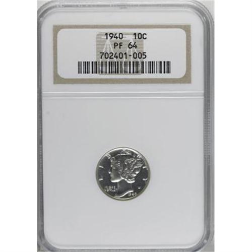 <B>1940 10C PR64 NGC.</B></I> NGC Census: (241/1502). PCGS Population (568/2058). Mintage: 11,827. Numismedia Wsl. Price for NGC/PCGS coin in PR64: $200. (#5075)<BR><BR><B>Coin Engraver:</B> Adolph A. Weinman<BR><BR><b>Shipping:</b> Coins & Currency (<a target="_blank" href="http://www.heritageauctions.com/common/shipping.php">view shipping information</a>)