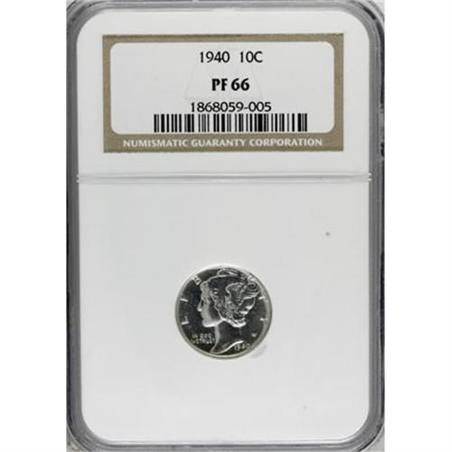<B>1940 10C PR66 NGC.</B></I> NGC Census: (780/282). PCGS Population (816/307). Mintage: 11,827. Numismedia Wsl. Price for NGC/PCGS coin in PR66: $320. (#5075)<BR><BR><B>Coin Engraver:</B> Adolph A. Weinman<BR><BR><b>Shipping:</b> Coins & Currency (<a target="_blank" href="http://www.heritageauctions.com/common/shipping.php">view shipping information</a>\)