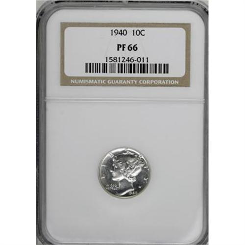 <B>1940 10C PR66 NGC.</B></I> NGC Census: (793/333). PCGS Population (822/311). Mintage: 11,827. Numismedia Wsl. Price for NGC/PCGS coin in PR66: $320. (#5075)<BR><BR><B>Coin Engraver:</B> Adolph A. Weinman<BR><BR><b>Shipping:</b> Coins & Currency (<a target="_blank" href="http://www.heritageauctions.com/common/shipping.php">view shipping information</a>)