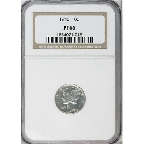 <B>1940 10C PR66 NGC.</B></I> NGC Census: (794/339). PCGS Population (833/313). Mintage: 11,827. Numismedia Wsl. Price for NGC/PCGS coin in PR66: $320. (#5075)<BR><BR><B>Coin Engraver:</B> Adolph A. Weinman<BR><BR><b>Shipping:</b> Coins & Currency (<a target="_blank" href="http://www.heritageauctions.com/common/shipping.php">view shipping information</a>)